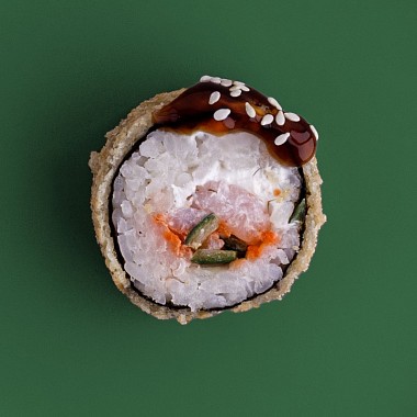 Состав: снежный краб, сливочный сыр, омлет, икра масаго, яки соус, унаги соус, кунжут.