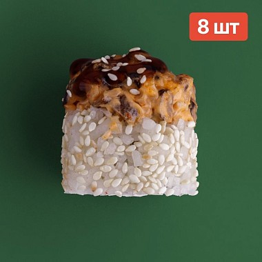 Состав: снежный краб, сливочный сыр, омлет, икра масаго, яки соус, унаги соус, кунжут.